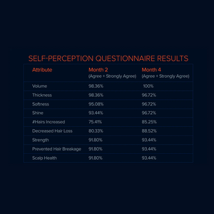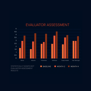 Under the conditions of the study, evaluator assessed hair attributes, shine, volume, thickness, softness and scalp health were statistically improved at each monthly assessment time point (p<0.05), hair strength was significantly improved over the four-month assessment period (p<0.05). Hair count of macro photographs increased (6.15) significantly between baseline (126.41 ± 49.62, n=61) and month four (132.56 ± 49.91, n=61; p<0.05).